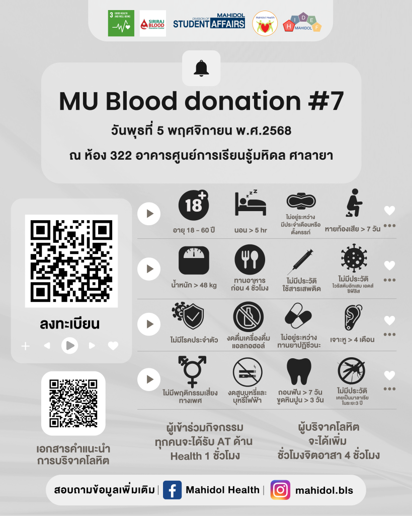 สอบถามข้อมูลเพิ่มเติมได้ที่ : Facebook: Mahidol Health หรือ Instagram: @mahidol.bls